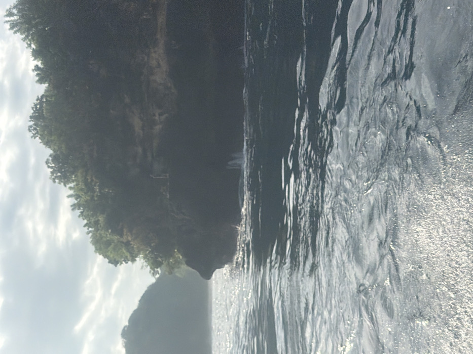 The scene, located in Sakti, Indonesia, features a body of water in the foreground and midground with an agitated surface showing distinct ripples and prominent glints of reflected light. A large, dark, rocky landmass, likely a cliff or island, occupies the right side of the frame, rising steeply from the water. This landmass is densely covered with green tropical vegetation on its upper sections. Multiple narrow streams of water are observed cascading down the cliff face, impacting the larger body of water below and creating visible splashes. A small, indistinct light-colored structure is discernible on the upper portion of this landmass, positioned near the tree line. A second, hazier landmass is present in the distant background to the left. The sky above displays scattered white and grey clouds. No individuals or vessels are present in the image.
