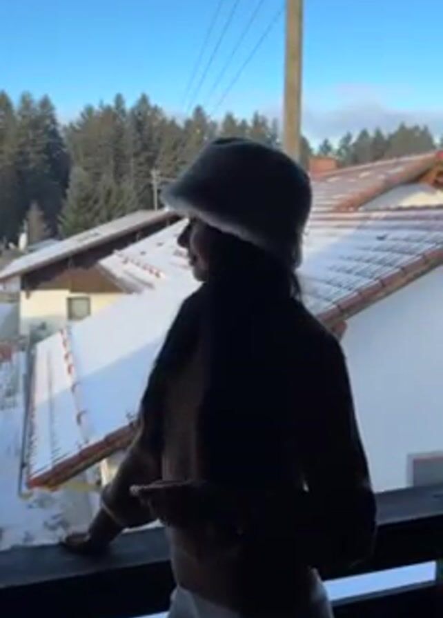 A woman stands on a balcony, silhouetted against a bright, snow-covered landscape. She wears a brown sweater, light-colored pants, and a furry bucket hat. Her long, dark hair falls down her back. She looks to her left, then turns her head towards the camera. The balcony has dark railings. Behind her, rooftops are covered in snow, and a dense forest is visible in the distance under a clear blue sky. A utility pole with wires runs vertically in the background.