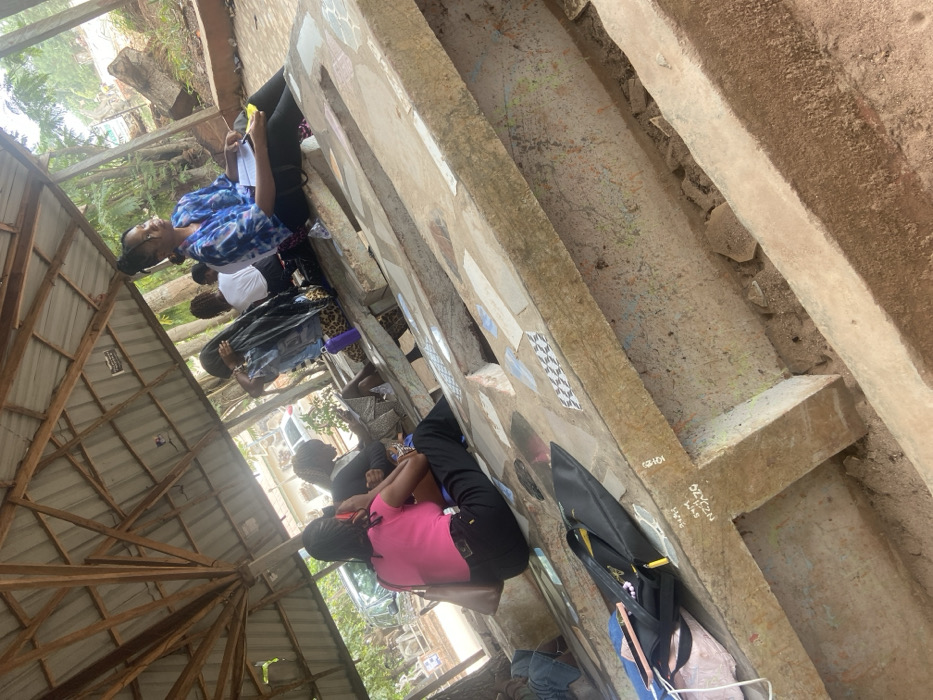 The image displays an outdoor communal seating area, likely a gazebo or open-air study space, within the city of Nsukka, Nigeria, consistent with a university campus such as the University of Nigeria, Nsukka. The structure features a pitched roof composed of corrugated metal sheets supported by a wooden rafter framework. Beneath the roof, multiple concrete benches and tables are arranged. These robust structures incorporate decorative inlaid mosaic tiles of various colors and patterns, including blue, white, black, and checkered designs. Approximately six to eight young adults, primarily female, are seated on these concrete surfaces. In the foreground, a female wearing a bright pink top and dark trousers is seated with her back partially to the camera, holding a dark smartphone to her left ear. A brown handbag is slung over her shoulder. On the ground near her, a black backpack with yellow accents and a light-colored bag with a smartphone on top are visible. To the right, another female in a blue and white patterned shirt and dark trousers sits, holding a yellow notebook and pen, appearing to observe something outside the frame. Further back, additional individuals are seated; one is partly visible with long dark braids and a patterned bottom, beside which a purple water bottle rests. The ground beneath the benches is reddish-brown earth, showing scattered debris and faint chalk-like markings or graffiti, including "KOHZ9," "SHM," and "52Y2JN" inscribed on a concrete surface. Beyond the structure, dense green vegetation and a white vehicle are visible, indicating an adjacent road or parking area. The scene is brightly lit by natural sunlight, suggesting daytime.