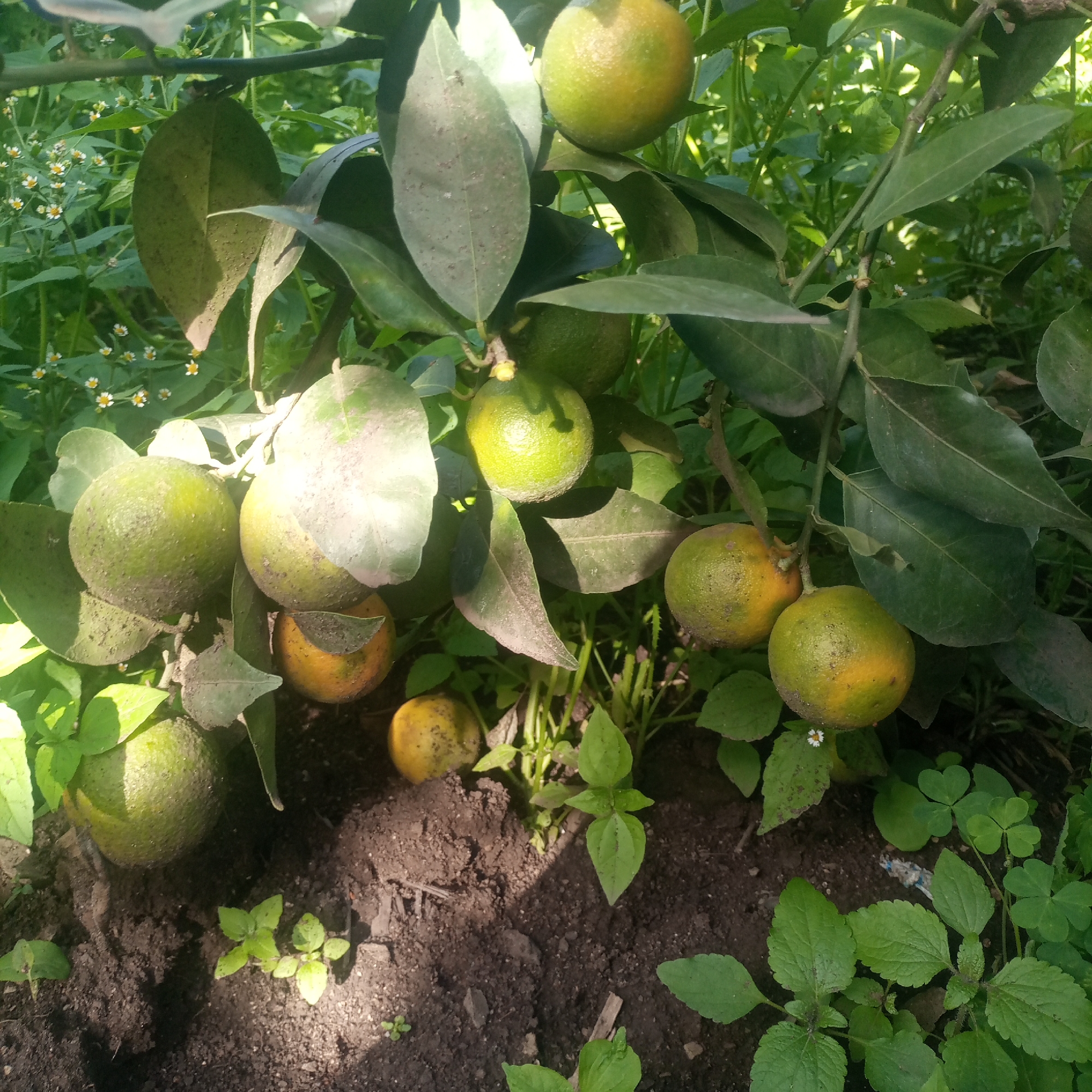 A close-up view shows a citrus tree bearing fruit in an outdoor environment within Kimorori/Wempa ward, Kenya. Approximately ten spherical citrus fruits are visible, varying in ripeness from green with yellow patches to more yellow-orange. Seven fruits remain attached to brownish-green branches, while two similar fruits are on the dark brown soil. Fruits and dark green ovate leaves show surface dust or blemishes. The ground is covered with dark brown soil and diverse green vegetation, including small white flowers with yellow centers and clover-like plants, extending into the background. Strong, direct sunlight illuminates the scene from the upper left, casting defined shadows on the soil. No people or animals are visible. No specific actions or interactions are occurring.