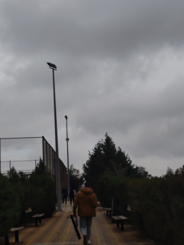 The image depicts an outdoor pathway under an overcast, grey sky in Jibb as-Safa, Syria. A single individual, seen from behind, walks away from the camera down a wooden plank pathway. This person wears an orange-brown jacket and light-colored trousers, carrying a dark, cylindrical object in their left hand. The pathway is flanked on both sides by dense green bushes and multiple wooden benches, which are unoccupied. In the mid-ground, a tall metallic light pole with a square fixture is positioned to the left of the pathway. Further back, another, shorter light pole is visible. Behind the bushes and the taller light pole on the left, a tall fence, possibly for a sports facility, is present. Several darker, unidentifiable figures are visible walking further down the pathway in the distance. The background features a cluster of dark green coniferous trees on the right side.