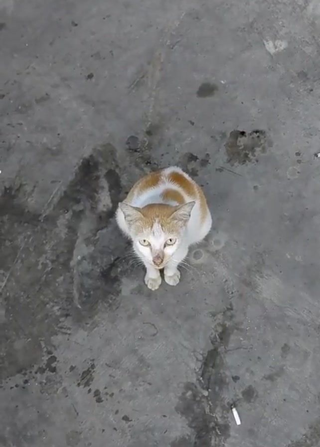 cat sitting on a concrete surface with oil stains and cigarette butts. The cat is mostly white with orange markings on its head and back. The camera then pans away from the cat to show a street at night with a streetlight and trees. A white bag is on the ground in the background.