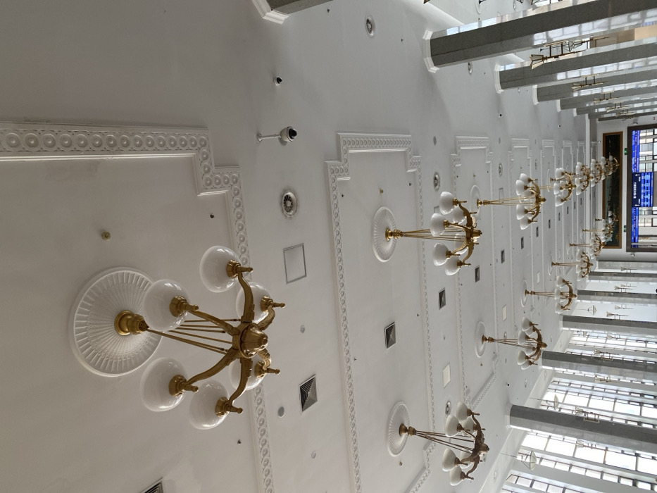 The photograph depicts an interior ceiling, likely of a grand hall or building. It features a series of decorative chandeliers with white glass globes and ornate gold fixtures. The ceiling is white with decorative molding, recessed lighting, and security cameras. A long, receding line of support beams and windows can be seen on the right side of the image, adding depth to the perspective.