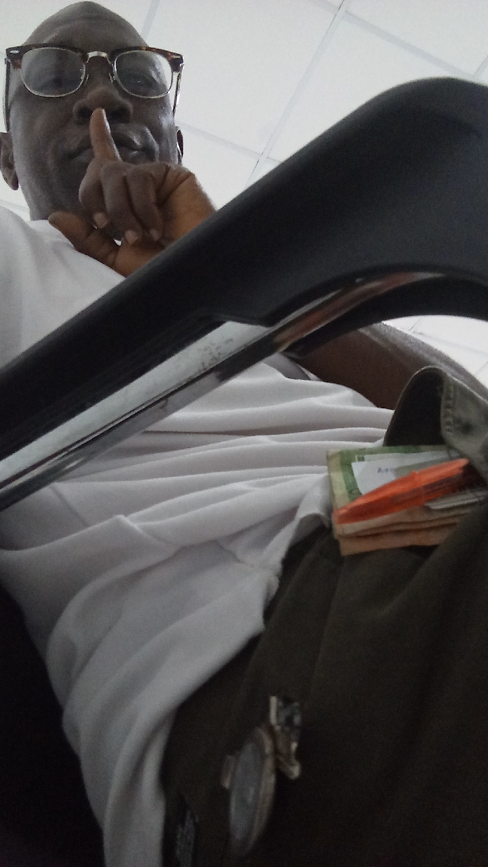 An adult male with dark skin and tortoise-shell framed glasses is depicted from a low-angle perspective, seated indoors. He wears a white t-shirt and dark trousers. His right index finger is pressed against his upper lip/nose area. A black armrest with a chrome metallic support bar extends across the lower left and center foreground, partially obscuring his torso. In his right trouser pocket, a stack of Nigerian Naira banknotes and other papers are visible, alongside an orange highlighter. A silver-toned wrist watch is present on his left wrist. The background consists of a light-colored ceiling with visible grid lines. The specific location within Lokoja, Nigeria, is not discernible from the image.