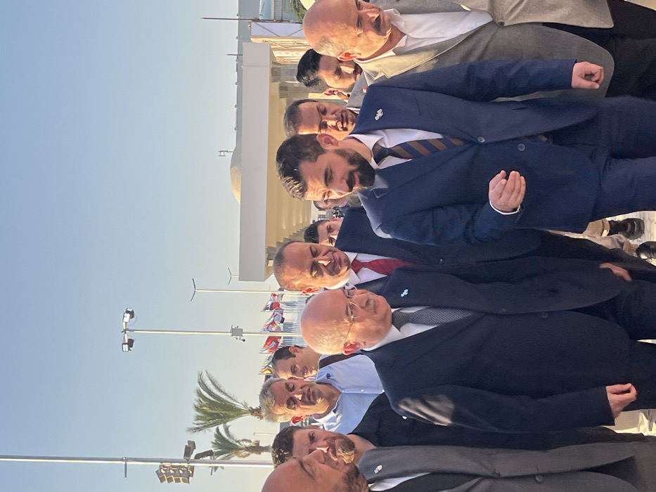 A group of approximately ten adult males is depicted walking outdoors under a clear blue sky in the city of Shab'a, Syria. In the foreground, two central figures walk side-by-side. On the left, an older man with glasses and a mustache wears a dark suit, white shirt, and patterned tie, with a light blue lapel pin affixed to his left lapel. He is looking slightly downwards and to his right. To his right, a younger bearded man wears a dark blue suit, white shirt, and a brown and light blue striped tie, with a matching light blue lapel pin on his left lapel. He appears to be looking downwards and forward. Several other men, dressed in a mix of suits, collared shirts, and casual attire, walk behind and to the sides of the two central figures. The background features modern streetlights, two visible palm trees, and a series of international flags mounted on poles. Further in the distance, a light-colored building with an arched entrance and a small dome is visible under the clear sky. The scene is illuminated by natural daylight.