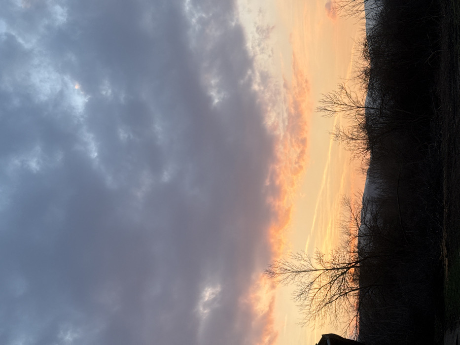 The scene depicts a twilight landscape within the city of Botevgrad, Bulgaria. The sky is characterized by layered cloud cover. The upper two-thirds consist of dense, dark grey clouds, with a small, brighter area of light visible through an aperture in the cloud mass. Below this, a horizontal stratum of clouds exhibits vivid orange, pink, and yellow coloration, intensifying towards the horizon. The lower third of the image is dominated by the dark silhouettes of numerous bare deciduous trees and leafless shrubs, suggesting late autumn or winter. The ground in the foreground is dark, possibly earth or undeveloped terrain. A dark, unidentifiable structure is partially visible on the extreme left. In the background, dark, undulating hills or mountains are silhouetted against the glowing horizon. No human or animal subjects are present, nor are any actions or interactions depicted.