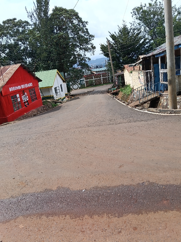The scene depicts an asphalt road ascending and curving slightly to the left in Kisii, Kenya. In the foreground, the road surface transitions from a light brown dirt or dust accumulation to a darker, possibly wet or recently paved section. No lane markings are present. On the left, a single-story red building with a corrugated iron roof is prominent. It features white text reading "BOSONGO BEVERAGES" and a white Coca-Cola logo. Four multi-paned windows are visible on its facade. Behind and uphill from this, a smaller, white single-story structure with a bright green corrugated iron roof stands. On the right side of the road, a utility pole stands vertically. Adjacent to it is an elevated structure with a light blue door and window frames, accessed by a set of concrete stairs with a dark metal railing. Its facade is a light, textured material, and it has a corrugated iron roof. Other less defined structures with corrugated roofs are visible further up the right side. Dense green foliage from numerous trees, including what appear to be pines and broadleaf trees, forms a significant part of the background and surrounds the buildings. A low, light-colored block fence with circular designs is visible further up the road on the left. Distant hills and urban structures are discernible under a partly cloudy sky. No individuals or vehicles are present in the frame.