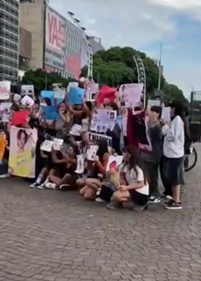 A crowd of people are gathered in an outdoor public area with a large display screen showing Coca-Cola branding. The people are holding up signs and pictures, with some signs clearly showing the name "ENHYPEN." Many of the people are kneeling or sitting on the ground, creating a dense and organized gathering. The background shows buildings and a modern cityscape, with a cloudy sky overhead. One person stands slightly away on a bicycle. The camera pans slightly to the left to capture more of the group and the surrounding cityscape. The people are cheering and chanting.