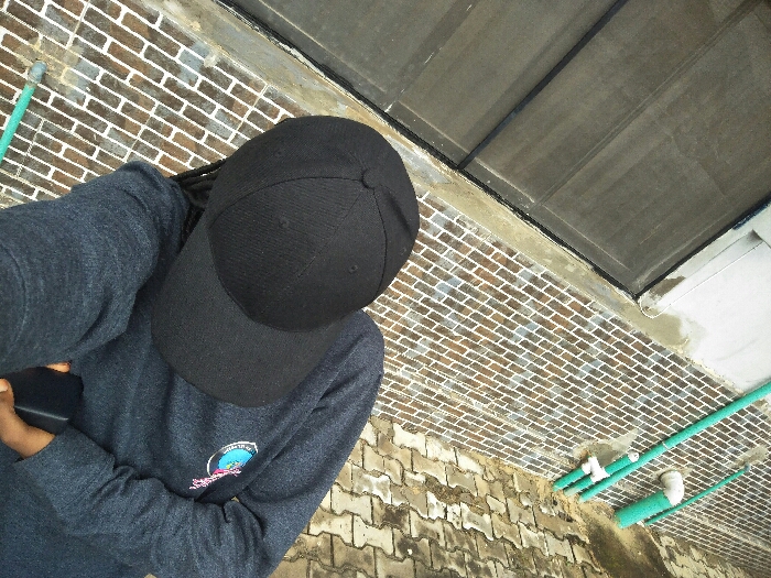 The image displays a scene in Iranla, Nigeria, featuring a single individual viewed from a high, tilted angle. The person wears a dark gray long-sleeved shirt with a multi-colored circular logo on the left chest, and a black baseball cap which obscures their face. Dark dreadlocks or braids are visible extending from beneath the cap behind the person's right ear. A dark, rectangular object, possibly a mobile phone, is held in the person's right hand. The ground surface is paved with interlocking concrete pavers, exhibiting varying shades and textures. Behind the individual is a brick wall constructed with light brown bricks and white mortar lines. Multiple green PVC pipes, some with white fittings, are affixed horizontally along the lower portion of this brick wall. Above the wall, a gray, panelled ceiling or underside of a roof structure is visible, separated from the brickwork by a concrete beam.