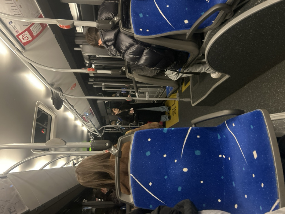 An interior shot of a bus featuring blue patterned seating. Passengers are scattered throughout. A person in a black puffer jacket sits in the front seat. Further down, other passengers are visible, including one with long brown hair. Metal handrails are prominent along the ceiling. Light fixtures provide illumination throughout the bus's interior.