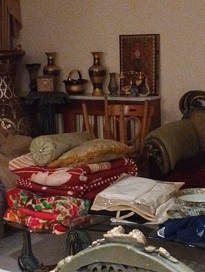 The image depicts an interior scene within a residential or formal space in Kafr Sousa Municipality, Syria. The composition focuses on a collection of decorative objects and textiles. In the upper background, a light-colored, textured wall serves as the backdrop for a wooden console table with a light-colored top, possibly marble. Displayed on the table are at least five brass or bronze-colored vases/urns of varying heights and designs, a small decorative brass basket, and a small rectangular ornate box. A dark cloth drapes over the left side of the table. To the right, a rectangular framed artwork or decorative panel, featuring red and dark intricate patterns, is leaned against the wall. Two wooden chairs are partially visible beneath the console table. In the midground, a stack of textiles is arranged on a dark, ornate metal stand with a glass surface. The uppermost items consist of a light green bolster cushion and a yellow-gold patterned rectangular cushion. Beneath these are several folded blankets or throws, including one predominantly red with white patterns and another displaying a colorful floral design incorporating red, green, and white. To the far right, a segment of a large, ornate armchair or sofa upholstered in a dark fabric with carved decorative elements is partially visible. In the immediate foreground, the back of another ornate chair obstructs the lower center of the frame. No individuals are present in the scene. The lighting is subdued, indicating an indoor setting with ambient light sources.