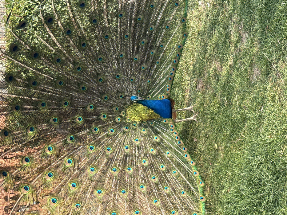 - "An adult male peacock (Pavo cristatus) stands centrally on a patch of short green grass in Krasnovo, Bulgaria, displaying its fully fanned iridescent upper tail coverts" by FM-EnvuH2, licensed under CC BY 4.0