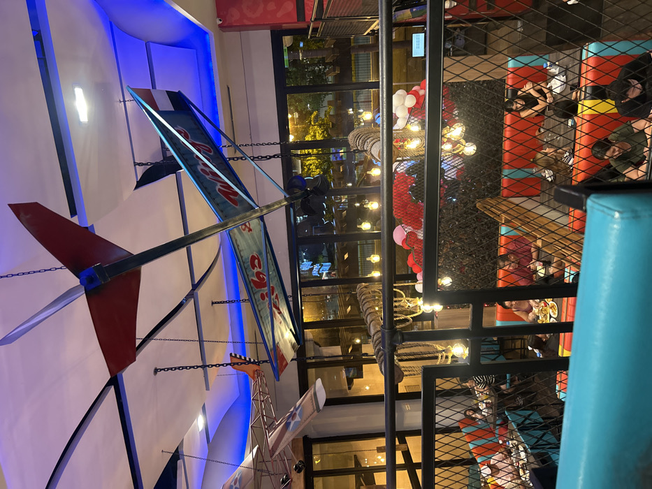 The image depicts an interior setting. A decorative airplane model hangs from the ceiling. Below, a multi-level dining area features people seated at tables. String lights and red and white balloons adorn the space. A metal grid partially obscures the view of the diners, creating a layered perspective. The scene appears to be a restaurant or entertainment venue.