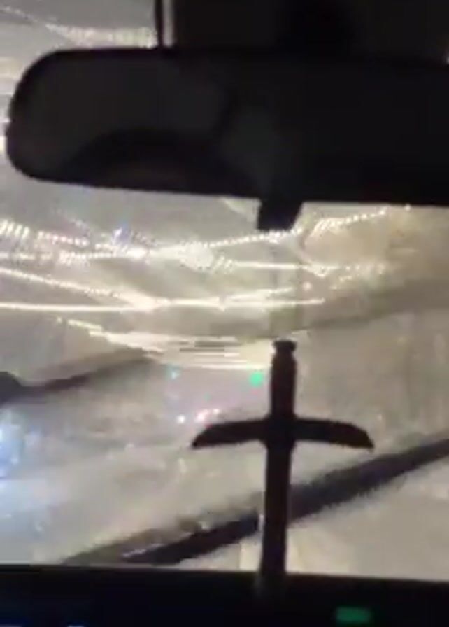 view from inside a car driving on a snow-covered road lined with trees adorned with strings of lights. The car's dashboard is visible, displaying the speedometer reading 43 mph and the time as 8:33. A cross hangs from the rearview mirror. Other vehicles are visible on the road ahead, their headlights illuminating the snowy conditions. It is snowing, and the visibility is affected by the snow.
