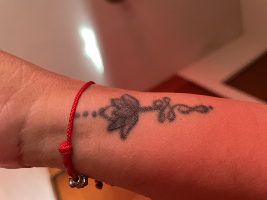 The image presents a close-up, angled view of the inner aspect of a human left forearm and wrist. A red string bracelet, secured with a knot, encircles the wrist, featuring multiple dull silver-toned metallic beads or charms clustered on its left side. Directly below the bracelet, a black-ink tattoo is situated on the forearm. The tattoo design comprises a lotus flower positioned at the superior end, followed by a vertical alignment of three small dots. Below these dots, an Unalome symbol unfolds, depicting a spiraling path transitioning into a straight line, which terminates in a single dot. The tattoo exhibits some fading. The skin surface shows typical creases and texture. The background is out of focus, characterized by blurred warm hues of reddish-orange and brown, indicative of an indoor setting with warm ambient lighting. A prominent, elongated bright white light reflection is visible in the upper right background quadrant. The visual content of this image does not provide any identifiable markers or contextual clues to determine its specific location within San Sebastián de Aparicio, Mexico, or any other geographical area. No direct actions or interactions are depicted.