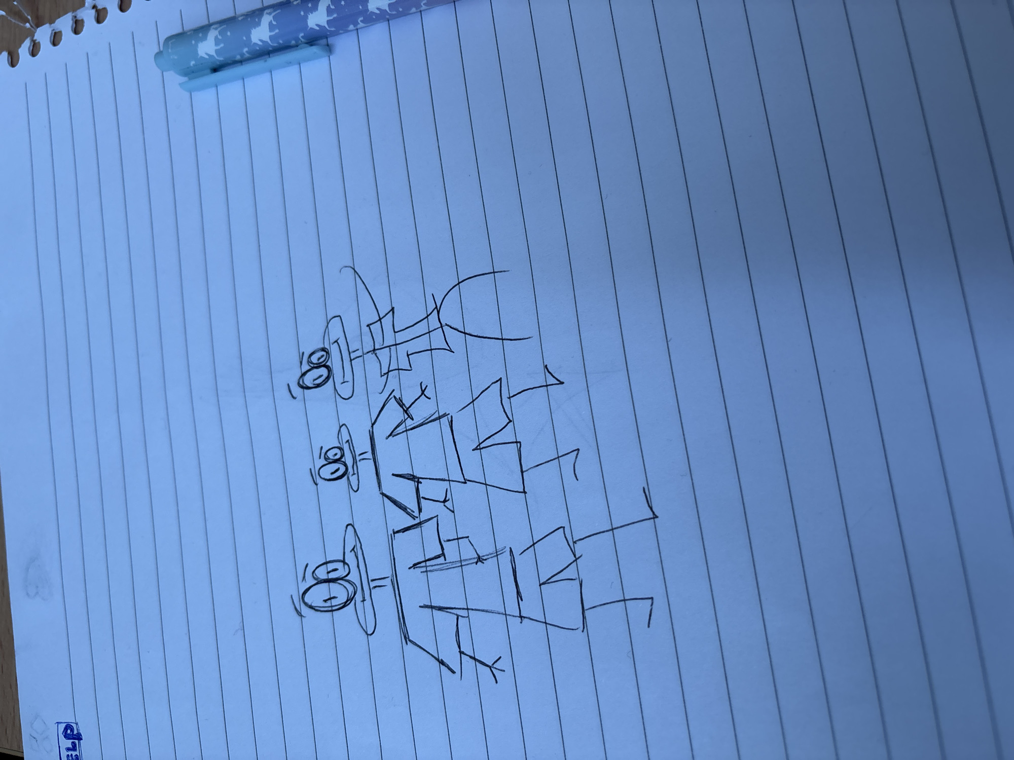 A piece of light blue lined notebook paper lies on a light-toned surface. This scene is located within the city of Kozloduy, Bulgaria. The paper displays a hand-drawn illustration in black ink featuring three stylized anthropomorphic figures arranged horizontally across the lower half. Each figure presents an oval head with two large circular eyes and a horizontal line for a mouth. Their bodies are simple, comprising a rectangular torso and rectangular lower garments. The figure on the far right has its right arm raised and bent at the elbow. In the upper-left corner of the paper, the partial blue text 'ELP' is visible within a rectangular outline. The right edge of the paper exhibits torn circular perforations. A light blue pen, its barrel decorated with a pattern of white unicorns against a gradient background, rests diagonally across the upper-right section of the paper.