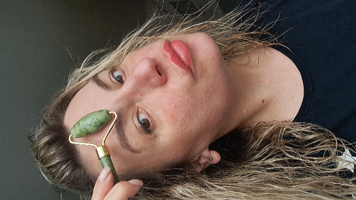 The image depicts a female subject from the chest up, positioned against a dark, featureless background. The subject has light-colored, wavy hair and visible skin texture with areas of light redness on the cheeks. Her right eye is directed towards the camera, while her lips are slightly puckered and exhibit a reddish tint. A small, gold-colored stud earring is present in her right earlobe. She is holding a jade facial roller with her right hand, applying the smaller, green, mottled stone end to her right forehead, specifically above her eyebrow. The roller features a gold-colored metal frame and handle. Her right index fingernail is visible. The subject is wearing a dark, crew-neck garment, consistent with a t-shirt. The specific location within the city of Меткомелино, Russia, cannot be determined from the visual information provided.