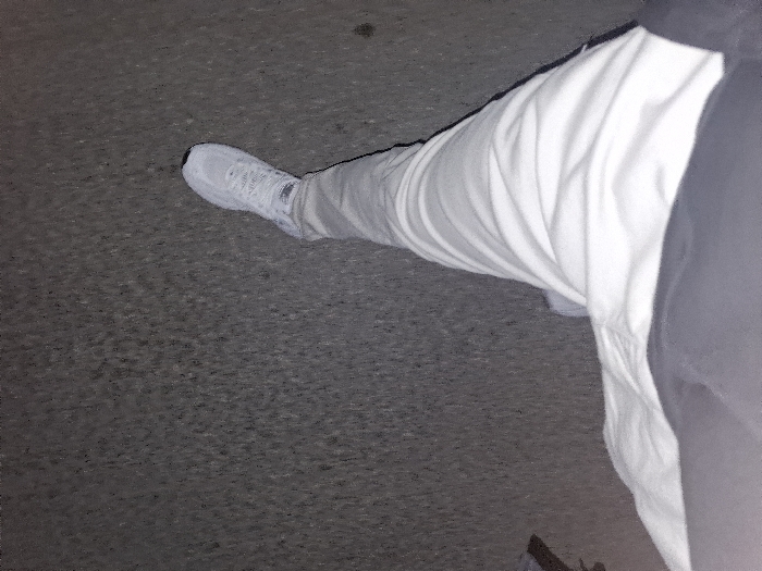 The image captures a first-person, downward perspective of an individual's lower body in Veliki Preslav, Bulgaria. A leg, clad in light-colored trousers, is extended forward, suggesting a walking motion. A white athletic shoe with dark accents on the sole is worn on the foot. In the lower foreground, a dark-colored garment, likely part of a shirt or jacket, is partially visible. The immediate environment consists of a dark grey, granular surface consistent with asphalt pavement. The scene is illuminated by low, ambient lighting, indicating dusk or nighttime conditions.