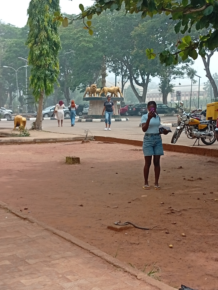 The image depicts an outdoor daytime scene on a reddish-brown dirt and paved ground, located near the distinctive Lion and Elephant Roundabout at the University of Nigeria, Nsukka (UNN) campus in Nsukka, Nigeria. In the foreground, a dark-colored snake, approximately 1.5 meters long, lies coiled and still on a small, square concrete block, with its body extending onto the dirt. Small, light-colored debris is scattered on the ground near the snake. A paved sidewalk edge runs along the bottom left. In the mid-ground, a young adult female with dark skin and braided hair stands facing slightly left. She wears a light blue short-sleeved top, blue denim shorts, and light-colored sandals, and holds a purple smartphone in front of her face with both hands, appearing to capture an image or video. A dark rectangular object is held in her left hand. To her right, a yellow motorcycle with chrome components is parked. Further back and slightly to the left, a circular monument features golden statues of three lions, one elephant, and a human-like figure atop a raised base. In the background, several individuals are present: one female walks from left to right near the monument, and two others walk away from the camera on the left side of the monument. A parking lot behind the monument contains multiple parked vehicles. Tall green trees, including a slender, tall tree on the left, dominate the background. Streetlights and a multi-story building are partially visible through the trees. The sky is hazy.
