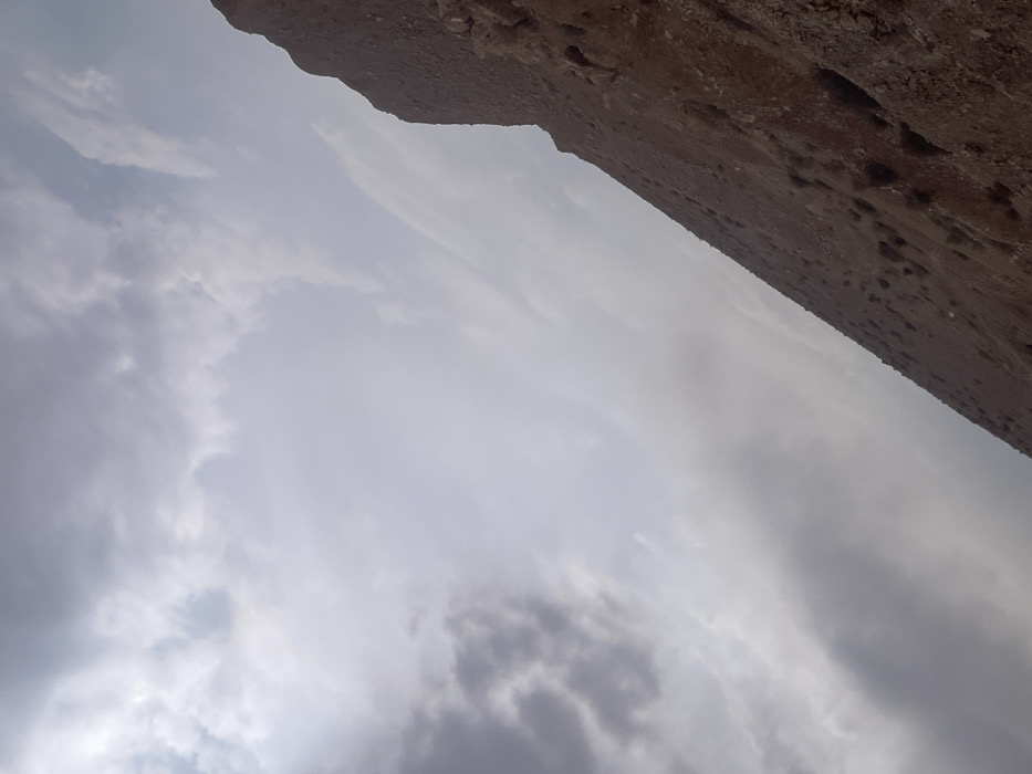 The scene depicts a natural outdoor environment in Al Qutayfah, Syria. A steep, reddish-brown rocky slope or hillside occupies the right portion of the frame, extending diagonally from the bottom-right towards the top-right. The slope's surface is irregular, composed of fragmented rock and soil, with scattered dark indentations and minimal, indistinct vegetation. The left and upper-left sections of the image are filled with an overcast sky, characterized by varying densities of gray clouds; brighter areas suggest diffused light penetration. No individuals, human-made structures, or animate subjects are visible.