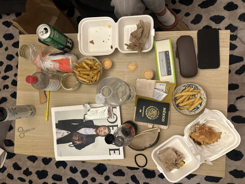 An overhead view depicts a light-colored wooden table cluttered with various objects, positioned on a beige carpet with irregular black patterns. The scene is located in Paris, France. A pair of metal scissors, a white Celsius beverage can, and a yellow pen are present. An open fashion magazine, displaying an upside-down image of a person with a handbag and partial "LOEWE" branding, rests on the table. A clear plastic bag containing a white item and a clear glass bottle with a red cap, labeled "BIODERMA," are visible. A green Heineken can, a thick off-white bangle, and a crumpled pink wrapper are also on the table. Food items include two small ceramic bowls of french fries, three small plastic cups of orange dipping sauce, and two open white styrofoam containers. One container is mostly empty with a crumpled brown napkin and food remnants; the other holds a partially eaten burger or sandwich with pickles. Personal belongings consist of a dark green Mexican passport, open on a light pink textured wallet holding cards, folded dark sunglasses, and a black elastic hair tie. Beverage containers include a large, clear plastic water bottle, a small dark glass bottle with a dark liquid, in addition to the Celsius and Heineken cans. Electronics and accessories include a white and lime green Bose SoundLink Mini speaker, a dark brown eyeglass case, and a black smartphone. Human presence is indicated by a foot wearing a brown slipper and striped pajama pants visible on the right side of the frame, and additional feet at the bottom center, resting on the carpet.
