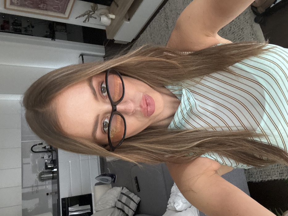 A woman with light brown hair and glasses poses indoors. She wears a light blue striped shirt. The background shows a kitchen with white cabinets, a faucet, and other kitchen appliances. A couch is visible in the lower portion of the frame. The photo appears to be taken at an angle, with the camera slightly tilted.