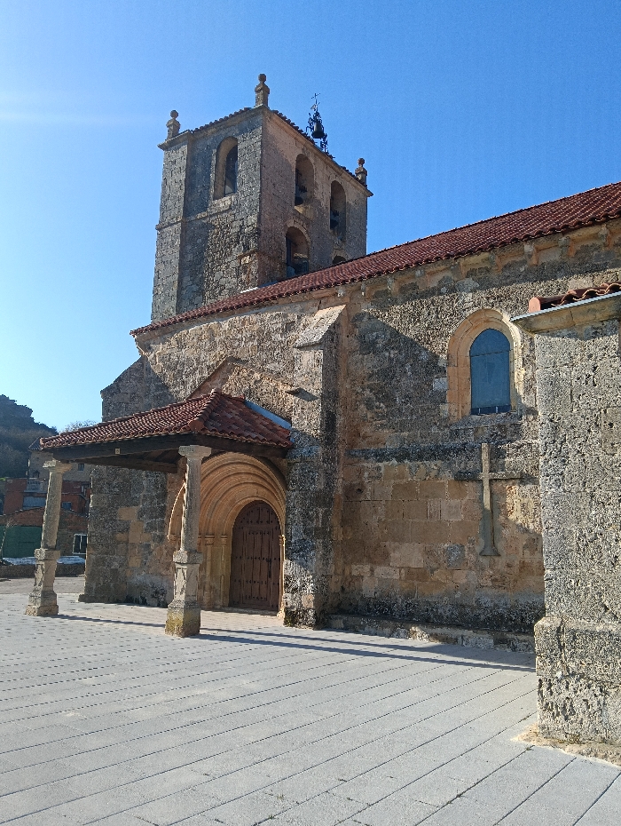 The image displays the exterior of a stone church in Montorio, Spain, captured from a paved forecourt under clear blue skies
