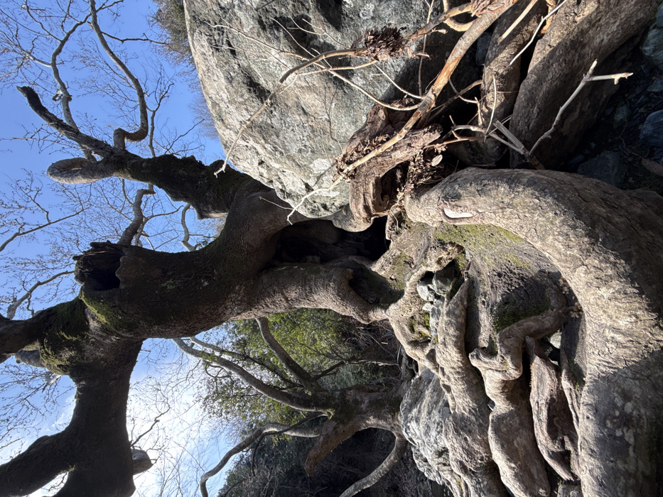 The image depicts an ancient, large-trunked Platanus tree (plane tree) in Therma, Greece, captured from a low-angle perspective looking upward. The tree's massive, gnarled trunk is central, covered in patches of green moss and featuring a prominent, dark hollow opening on its upper-left side. Its bare branches extend widely against a clear, bright blue sky, indicating a season without full foliage. The tree's powerful roots are a dominant feature, spreading extensively over and around the rocky terrain at its base. These thick, undulating roots entwine with large, grey boulders, some of which appear smooth while others show rougher textures. A significant portion of a large, light grey rock is visible on the right side of the frame, partially obscured by the tree's roots and some dry, fragmented branches or logs. Smaller rocks and pebbles are visible amidst the roots and ground further back. In the mid-ground to the left, other deciduous trees with bare branches are present, suggesting a natural, possibly riverside or forested environment. Patches of green foliage are visible further in the background, contrasting with the bare branches of the foreground trees. The scene is illuminated by natural sunlight, casting shadows and highlighting the textures of the tree bark, roots, and rocks. There are no people, animals, or man-made structures immediately visible within the primary frame.