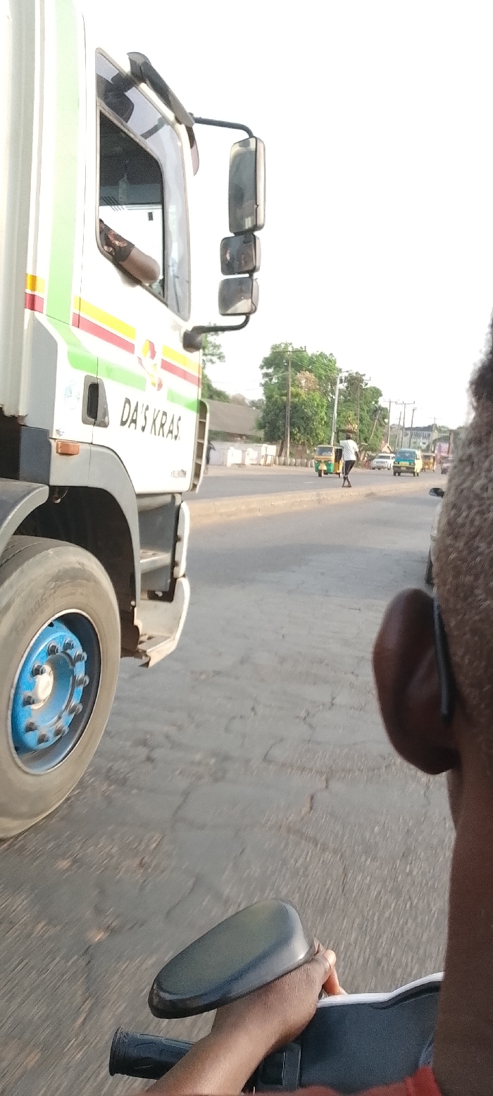 A partial view from a moving motorcycle shows a large truck with "DA'S KRAS" printed on its side. The truck's wheel, cab, and side mirrors are visible. Beyond the truck, a street scene unfolds with pedestrians, tuk-tuks, and parked cars. The blurred ear, part of the head, and hands of the motorcycle rider are in the foreground, framing the scene. The road ahead is cracked and slightly dusty. The image is taken in daylight with a clear sky.