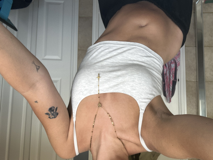 An individual is depicted indoors, from the chest to the upper thighs, within what appears to be a residential bathroom or bedroom located in the city of North Hertfordshire, United Kingdom. The subject wears a light grey or white sleeveless crop top and dark-colored lower garments. A long, gold-colored beaded necklace with a small crucifix pendant is worn around the neck, extending to the midriff. The right arm exhibits three black tattoos: an abstract, potentially animal-like design on the upper arm, a small inverted triangle on the forearm, and a minimalist outline of a martini glass closer to the wrist. The background on the left features a tiled wall and a reflective vertical surface, while the right side shows a closed white door with a handle. A pink and white plaid garment is visible hanging in the background, to the left of the door. The individual is positioned leaning slightly forward, with the right arm extended.