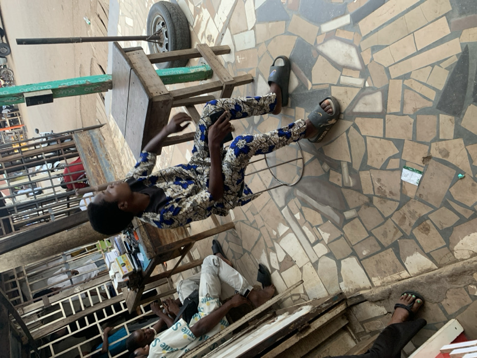 The scene depicts a street-level commercial area in Kabba, Nigeria, characterized by a multi-toned, irregularly tiled pavement. In the foreground, a young male wearing a patterned blue and white long-sleeved shirt and matching trousers, along with grey slide sandals, is seated on a chrome-legged stool. He holds a dark-colored smartphone in his left hand and gazes towards the right. To his left, another male, partially visible, is seated on a wooden bench, wearing a light-colored patterned shirt and light trousers, with black slide sandals. Between these two individuals is a wooden table displaying electronic devices, including a laptop and various boxes. To the right of the central figure stands another simple wooden table. The background reveals a street with parked motorcycles and other vehicles, several individuals, and metal-grated storefronts. A green-painted utility pole, bearing partial text (possibly "Airtel" or "MTN") and a black electrical box, is visible. Adjacent to it, a car tire rests on a metal stand. Natural daylight illuminates the scene, creating shadows.