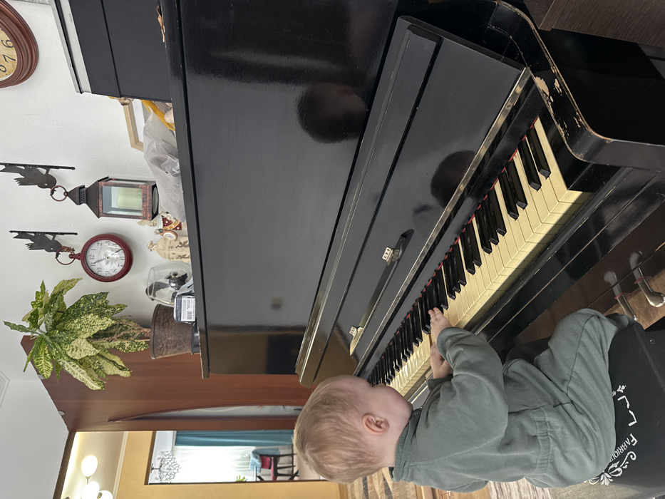 Within a residence in Elovo, Russia, a young child with fair hair, dressed in a solid sage green long-sleeved jumpsuit, is seated on a black stool with white lettering. The child faces right in profile, with both hands positioned on the keys of a black upright piano, appearing to depress them. The piano exhibits wear, with chipped paint on its lower right side and yellowed white keys. Three pedals are visible at the base. The piano's top surface holds various objects: a potted plant with variegated leaves in a dark pot, a clear glass bowl with dark contents, a small dark rectangular object, and assorted decorative figurines, including one resembling a rabbit, alongside an item wrapped in light-colored material. Above the piano, mounted on a white wall, are two decorative items: a red-framed circular clock on the left and a rustic red-brown metal lantern with a candle on the right, both suspended from black bird-shaped brackets. A partial view of another larger clock is visible further right. To the left of the piano, a dark wooden doorway opens into an adjacent room. This background room features light-colored walls, a multi-light chandelier, a window with light blue curtains, and a partially visible reddish-brown chair and table. The foreground floor is covered by a patterned rug with wavy brown and beige lines.