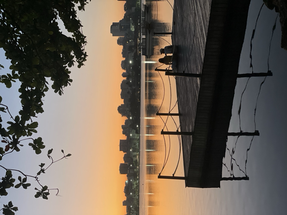 A serene cityscape reflected in water under a pastel orange sky. On the right, a dark wooden dock extends into the water, its railing casting linear shadows. Two figures sit at the end of the dock, their forms small against the backdrop. The left side of the image features foliage, adding a natural element to the urban scene. The composition evokes a sense of calm and contemplation.