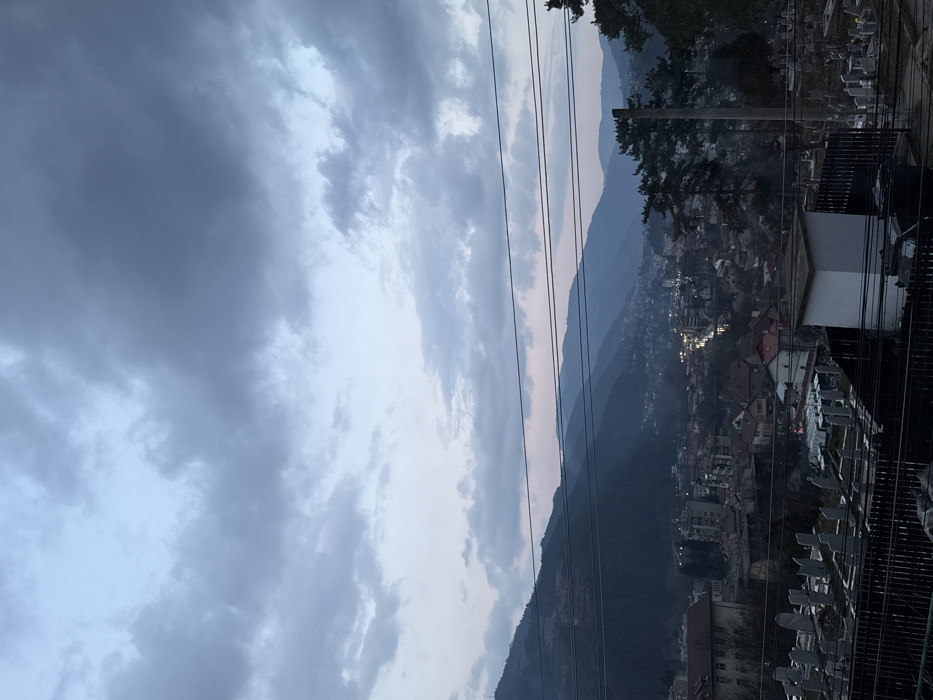 An elevated, wide-angle photograph captures a twilight view of the city of Svoge, Bulgaria, nestled within a mountainous valley under a cloudy sky. The sky, occupying the upper two-thirds of the image, displays a palette of light blue, grey, and faint pink hues, indicative of either dusk or dawn, with numerous stratocumulus cloud formations. The middle ground presents multiple layers of dark, forested mountains receding into the distance, demonstrating atmospheric perspective. The city of Svoge spreads across the valley floor, characterized by a dense arrangement of buildings, primarily residential with reddish-brown roofs, some of which are illuminated by interior lights. A prominent street cuts through the city, distinguishable by a continuous line of bright streetlights. The immediate foreground reveals a cemetery occupying the lower left and right sections. Rows of light-colored, rectangular grave markers are visible, densely packed. A dark fence, likely made of metal, runs horizontally across the lower part of the frame, separating the viewpoint from the cemetery. Adjacent to or within the cemetery on the right, a small, white, cubic structure with a flat, dark roof is present. To the left of the cemetery, a multi-story building with a light facade and dark roof is partially visible. Several dark utility lines or power cables traverse the scene horizontally across the mid-foreground, partially obscuring the view of the city and distant mountains. A dark utility pole with an attached fixture is visible on the far right, partially obscured by evergreen trees. No people or discernible actions are visible within the frame.
