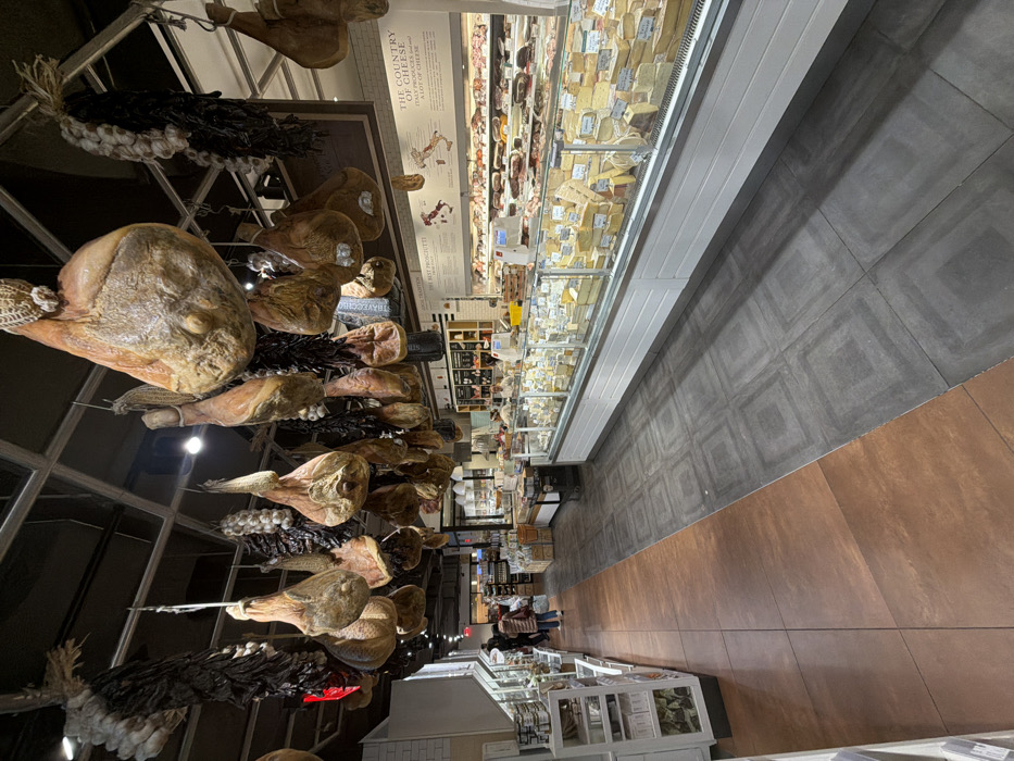 gourmet grocery store interior with legs of prosciutto hanging from the ceiling alongside bundles of garlic. To the right, refrigerated displays showcase rows of cheese. The floor is tiled with a mix of dark gray and brown. Customers can be seen browsing in the distance. The scene is well-lit, highlighting the variety of specialty foods.