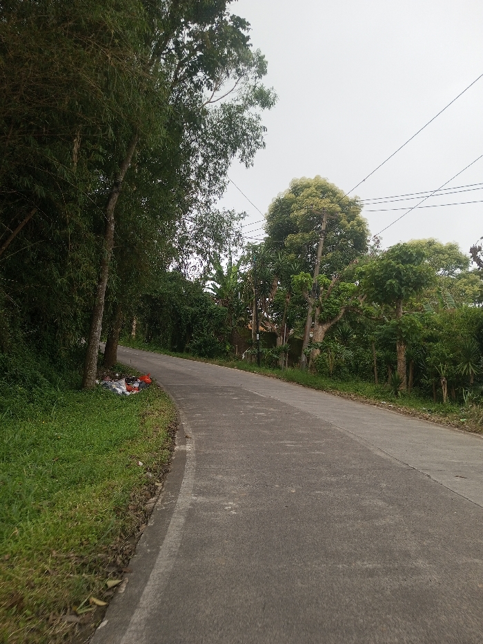 An asphalt road curves upward through a landscape of lush greenery. Tall trees line the left side, while dense vegetation fills the right. Overhead, power lines traverse the sky. Some scattered trash rests on the grassy area to the road's left. The gray overcast sky suggests a muted light, and the road itself appears worn, suggesting the setting might be a rural or suburban neighborhood.