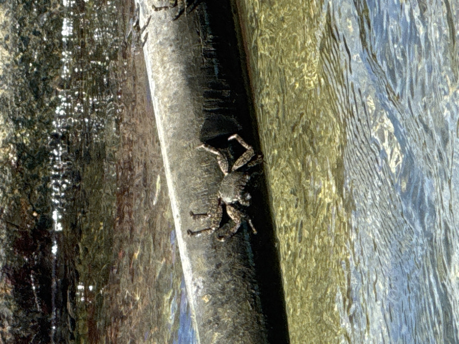 The image depicts an aquatic scene in Vĩnh Lương, Vietnam. A dark, cylindrical object, appearing to be a pipe or log, extends horizontally across the frame, partially submerged in water. Centrally positioned on this object is a single crab, mottled brown and gray, clinging to the surface with its legs splayed, appearing partially inverted. An additional crab is visible further to the right on the same cylindrical object, and a less distinct crab-like form is partially visible on the far left. The surrounding water exhibits ripples and reflections on its surface, with areas of clearer water revealing a greenish-brown tint beneath. The background consists of an out-of-focus area, suggesting distant natural elements or a shoreline. No people are present.