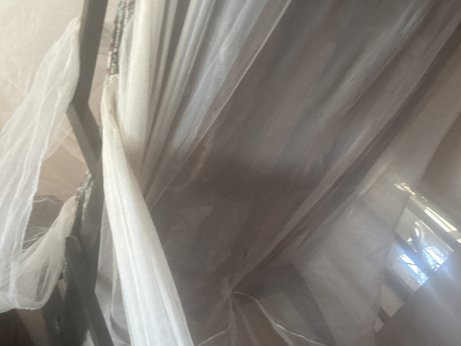 An interior scene in New Nyanya, Nigeria, is viewed through multiple layers of sheer, light-colored fabric, consistent with a mosquito net