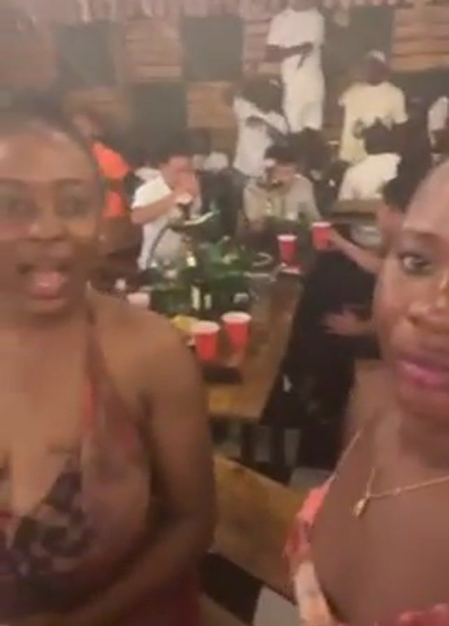 Two women are taking a selfie video in what appears to be a bar or lounge