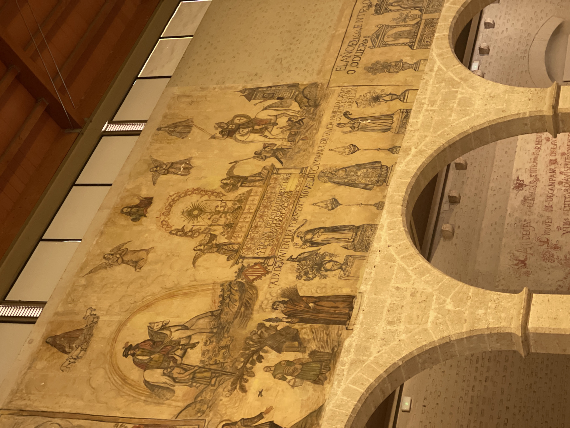 - "The image displays a detailed historical narrative mural covering a large section of a textured, light beige wall within the Consolat de Mar (Consulate of the Sea) room of the Lonja de la Seda (Silk Exchange) in Valencia, Spain" by FM-D8nzh1, licensed under CC BY 4.0