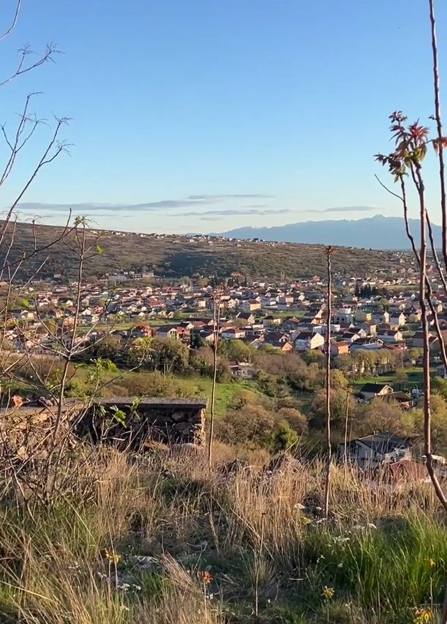 daytime view of a town nestled in a valley. The camera is positioned on a slightly elevated, grassy area with some sparse vegetation in the foreground. The town is characterized by tightly-packed houses, with a variety of architectural styles, including those with red-tiled roofs. In the distance, mountains can be seen on the horizon. The sky is clear blue with some wispy clouds. Some voices can be heard.