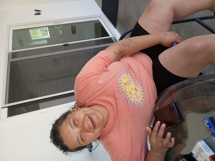 A single adult female is depicted seated at an outdoor glass-topped table on what appears to be a residential patio in Los Angeles, United States of America. She is smiling directly at the viewer. The woman has dark hair and is wearing a peach-colored short-sleeved t-shirt with a "MAUI" sun graphic, and black athletic shorts. Tattoos are visible on her left forearm (a star and a rose) and a small heart on her right hand. An earpiece is present in her left ear. On the glass-topped table are a dark-colored smartphone, a pack of Marlboro cigarettes, a blue Bic lighter with a graphic, and a dark ashtray containing cigarette butts. The background consists of a white exterior wall and a white-framed sliding glass door. Through the door, an interior room with a window and horizontal blinds is visible. A dark doormat is positioned outside the sliding door.