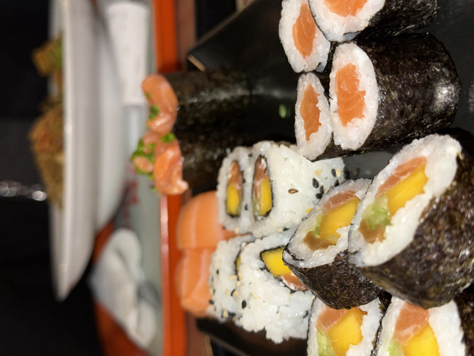 A close-up shows a stack of sushi rolls