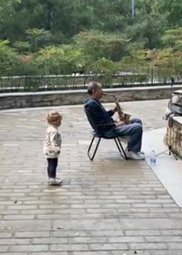 In an outdoor scene, a man sits on a black folding chair, playing a saxophone. He's dressed in a dark jacket, jeans, and white sneakers. To his left, a young child stands on a brick-paved area, facing him. The child wears a printed top, dark leggings, and light-colored shoes. The background features green trees and foliage, with a low stone wall lining the periphery. A clear water bottle rests on the ground near the man's chair. The area is well-lit, suggesting daytime.
