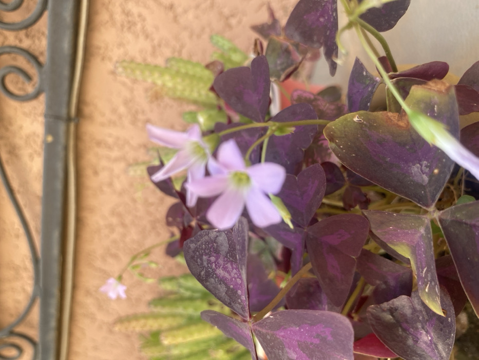 - "A close-up image captures a potted plant with dark purple, tri-lobed leaves (*Oxalis triangularis* or similar) bearing small, pale purple, five-petaled flowers, set against a textured, light orange wall in Barden Yana, Nigeria" by FM-qtG7Q2, licensed under CC BY 4.0