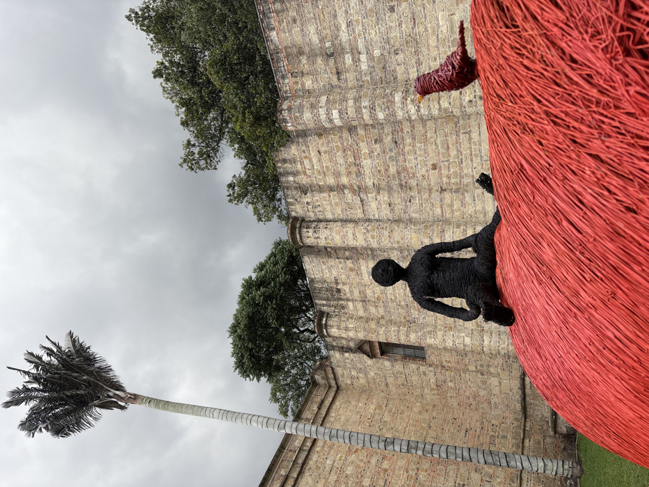 A low-angle shot shows a tall palm tree against a cloudy sky near a stone building. The building has two trees along its top edge. A large, red, round sculpture dominates the foreground with a dark, human-like figure clinging to it. A smaller, red bird sculpture is perched on the building's edge above the human figure. The entire scene is slightly rotated counterclockwise.