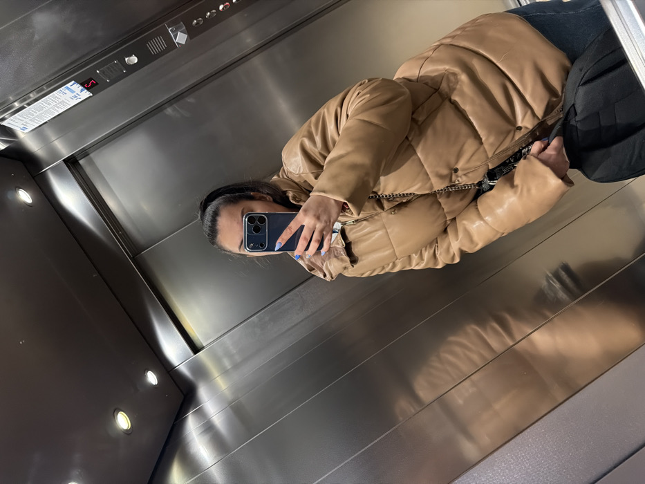 A single female individual is captured taking a mirror selfie inside an elevator. Her face is partially obscured by the dark-colored smartphone she holds in her left hand, revealing blue nail polish. Her dark hair is pulled back into a high ponytail. She is wearing a light brown, quilted puffer jacket with a high collar, beneath which a patterned garment is visible. A thin, dark chain is draped across her upper torso. Her right hand appears to hold a black bag or backpack resting against her lower body, above visible dark blue trousers. The elevator interior features polished metallic walls and ceiling, equipped with multiple recessed circular light fixtures. An elevator control panel on the right wall includes several buttons, an illuminated digital display showing the number "5" and an upward arrow, and what appears to be a directory or instructions above it. The specific location within the city of Varna, Bulgaria, is undeterminable from the visual evidence.