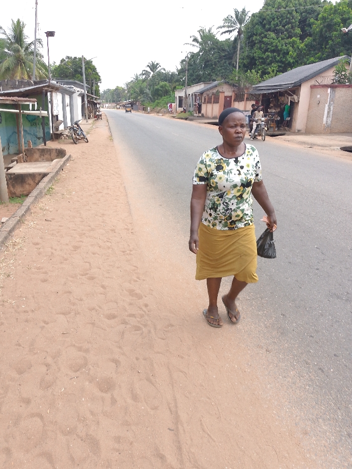 The scene depicts a street in Alor, Nigeria, under an overcast sky. A woman, appearing to be middle-aged, walks towards the viewer's right, positioned primarily on the paved roadside. She wears a short-sleeved, floral-patterned top with white, green, and yellow hues, a plain yellow or mustard-colored knee-length skirt, and dark flip-flops. Her hair is dark and pulled back, covered by a black band. She carries a dark, possibly black, plastic bag in her right hand, which hangs at her side. To her left, a sandy, unpaved strip functions as a sidewalk, bordering a concrete curb and a drainage ditch. Beyond this, a row of single-story commercial or residential buildings with varied facades and corrugated metal roofs line the road. One building has a light blue lower section with "EBO G S" visible. A parked motorcycle with a dark frame is visible near these structures. Palm trees and dense green foliage rise behind the buildings and extend into the distance. On the opposite side of the two-lane asphalt road, more single-story structures are present, some appearing to be shops with goods displayed. Several individuals are visible near these buildings, and a person is seated on a motorcycle in front of one structure. Further down the road, a yellow three-wheeled vehicle, possibly an auto-rickshaw or Keke NAPEP, is in motion. The distant background shows a continuous line of tropical trees and vegetation under the bright sky. The road surface exhibits some cracks and variations in tone.
