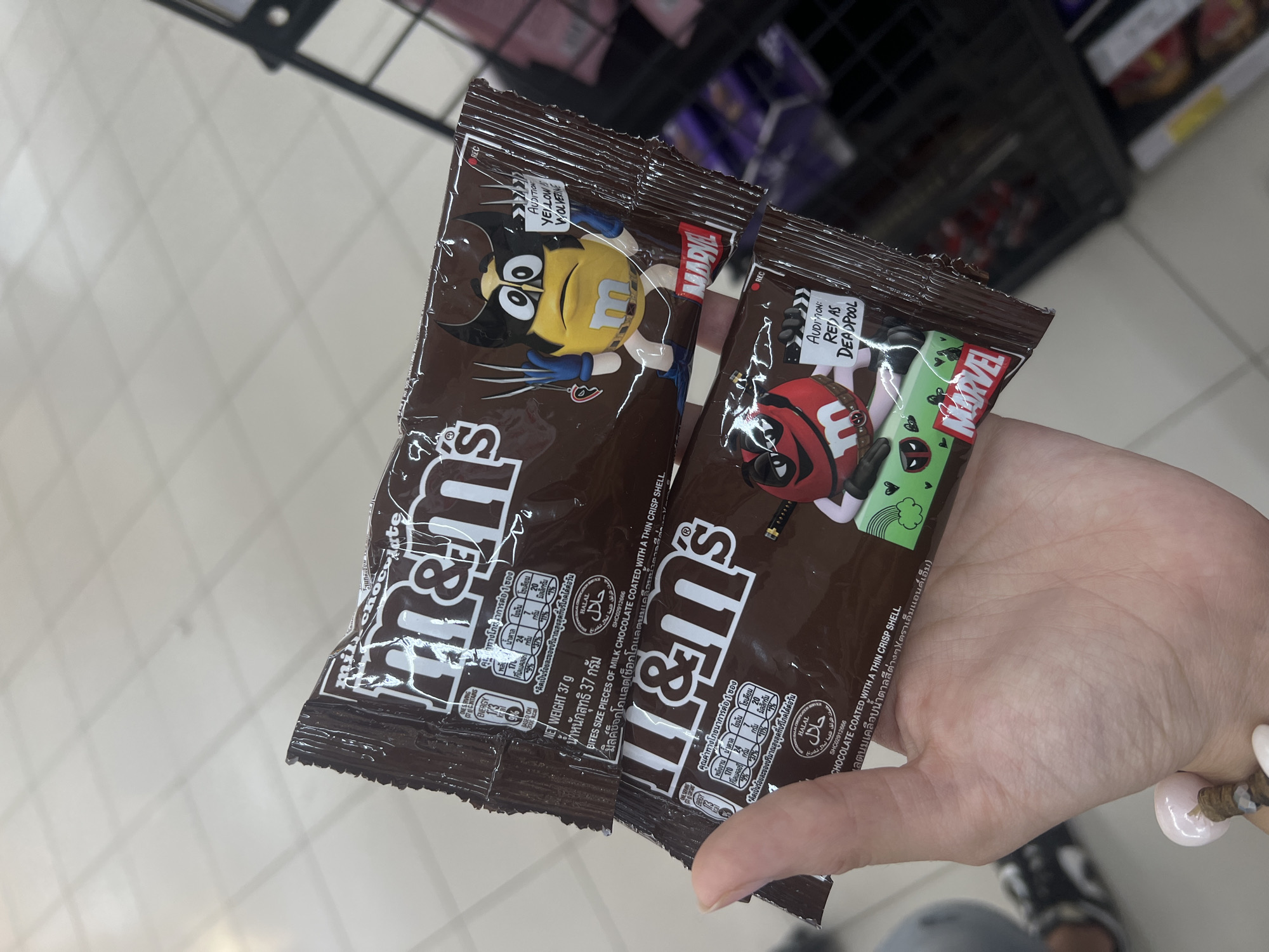 A hand holds two individual packets of M&M's chocolate candies. The packet on the left features a yellow M&M character dressed as Wolverine, and the packet on the right features a red M&M character dressed as Deadpool. The packaging is brown, and the M&M's logo is prominently displayed. The text on the packaging is in both English and Thai. A supermarket shelf with various items is visible in the background. The floor beneath the hand is tiled in white. The setting appears to be inside a supermarket, potentially in Nha Trang, Vietnam, given the multilingual packaging.