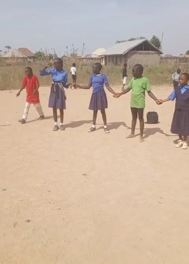 group of children on a dirt field, appearing to be playing a game. They are holding hands, forming a circle, and moving around. The children are wearing various clothes, some in school uniforms. The setting appears to be a rural area with simple buildings in the background. The sky is bright and sunny. There is vegetation and dry grass scattered around the field. Other children are standing nearby, observing.